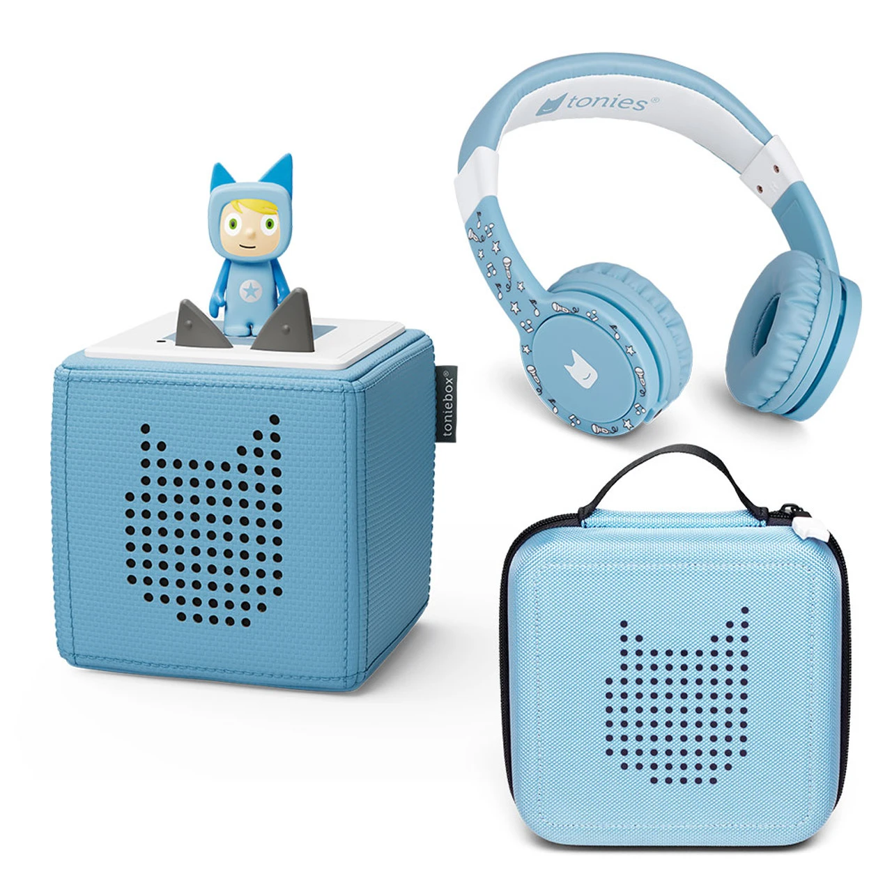 The Tonies Starter Bundle provides everything you need to get started: A Toniebox, charging station, an adorable Creative Tonie, matching Foldable Headphones and Carry Case.