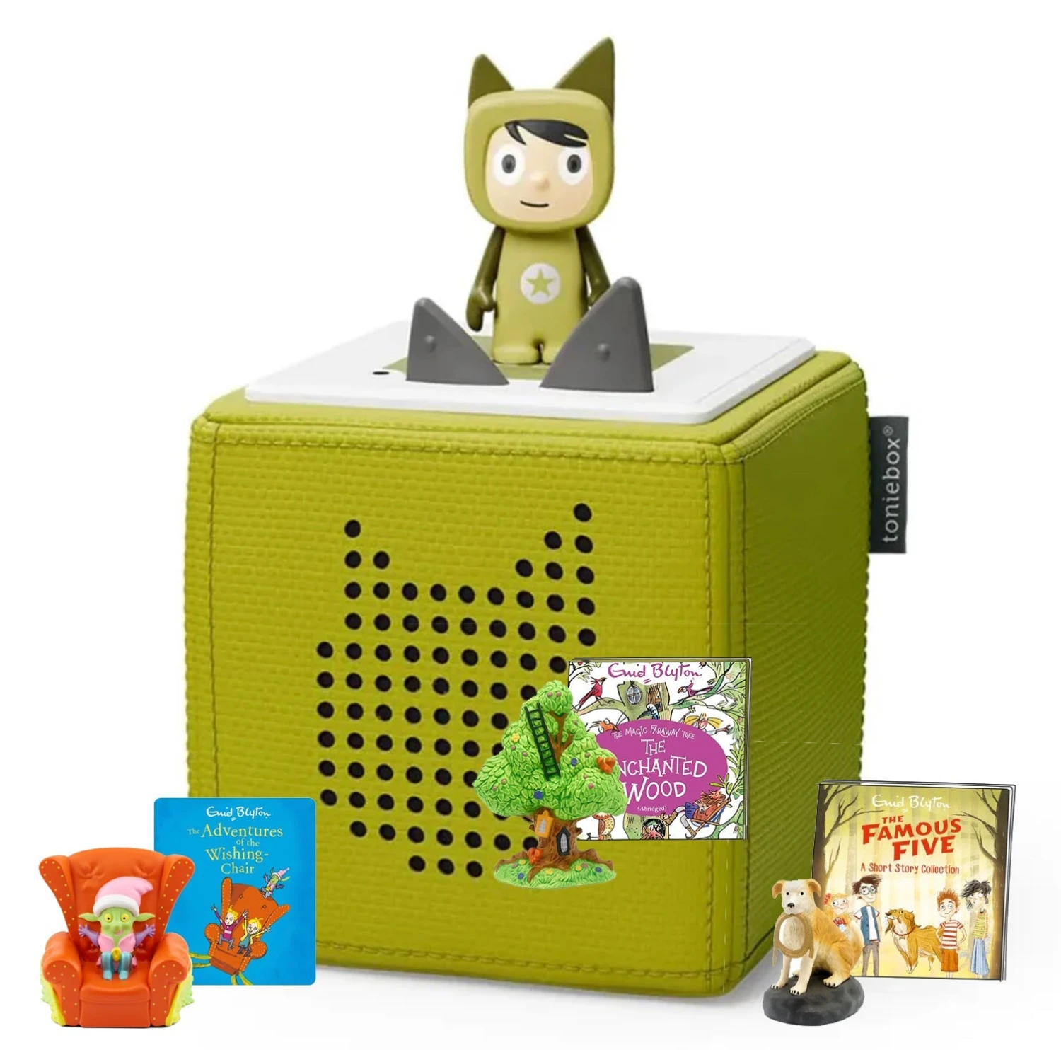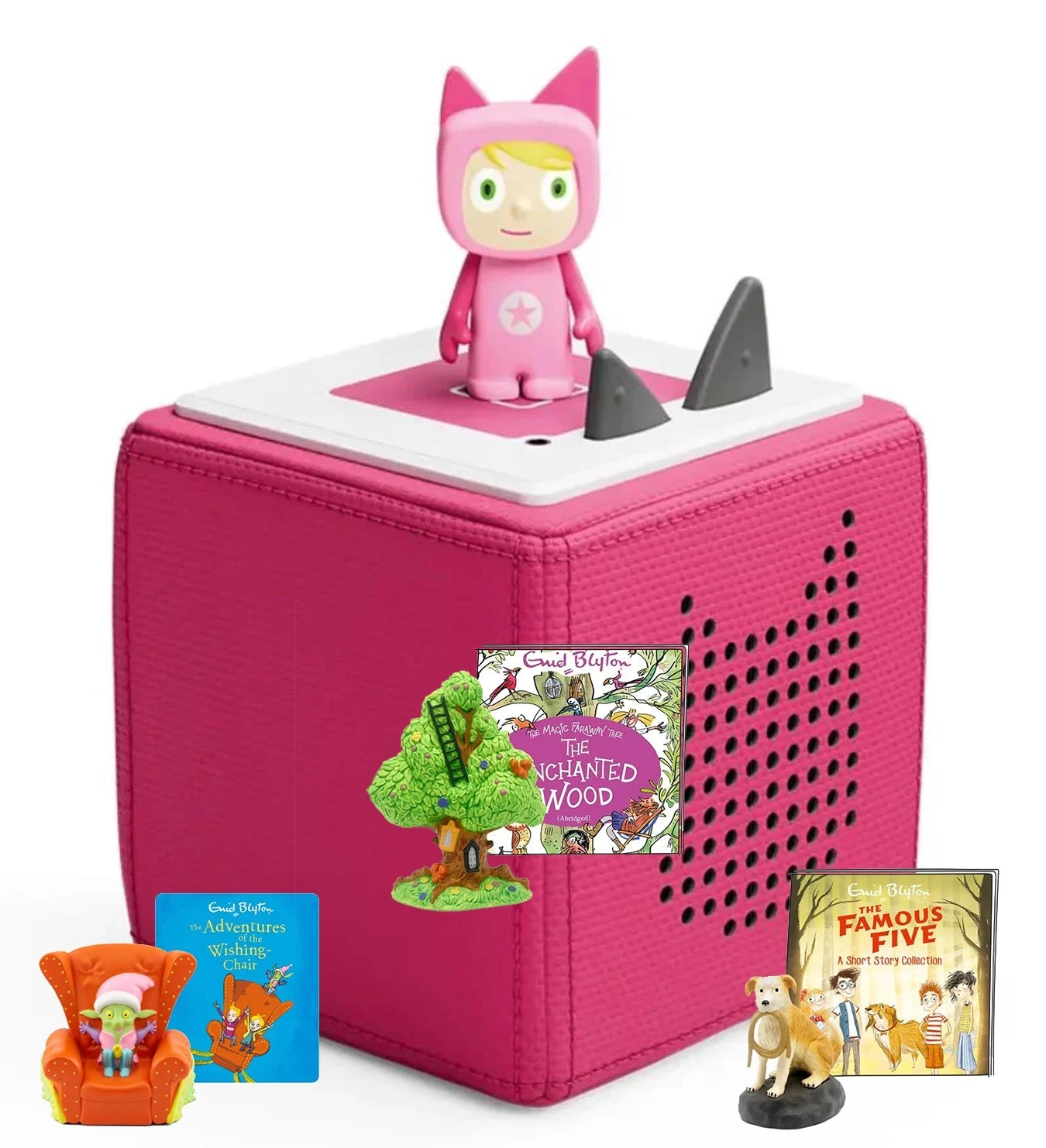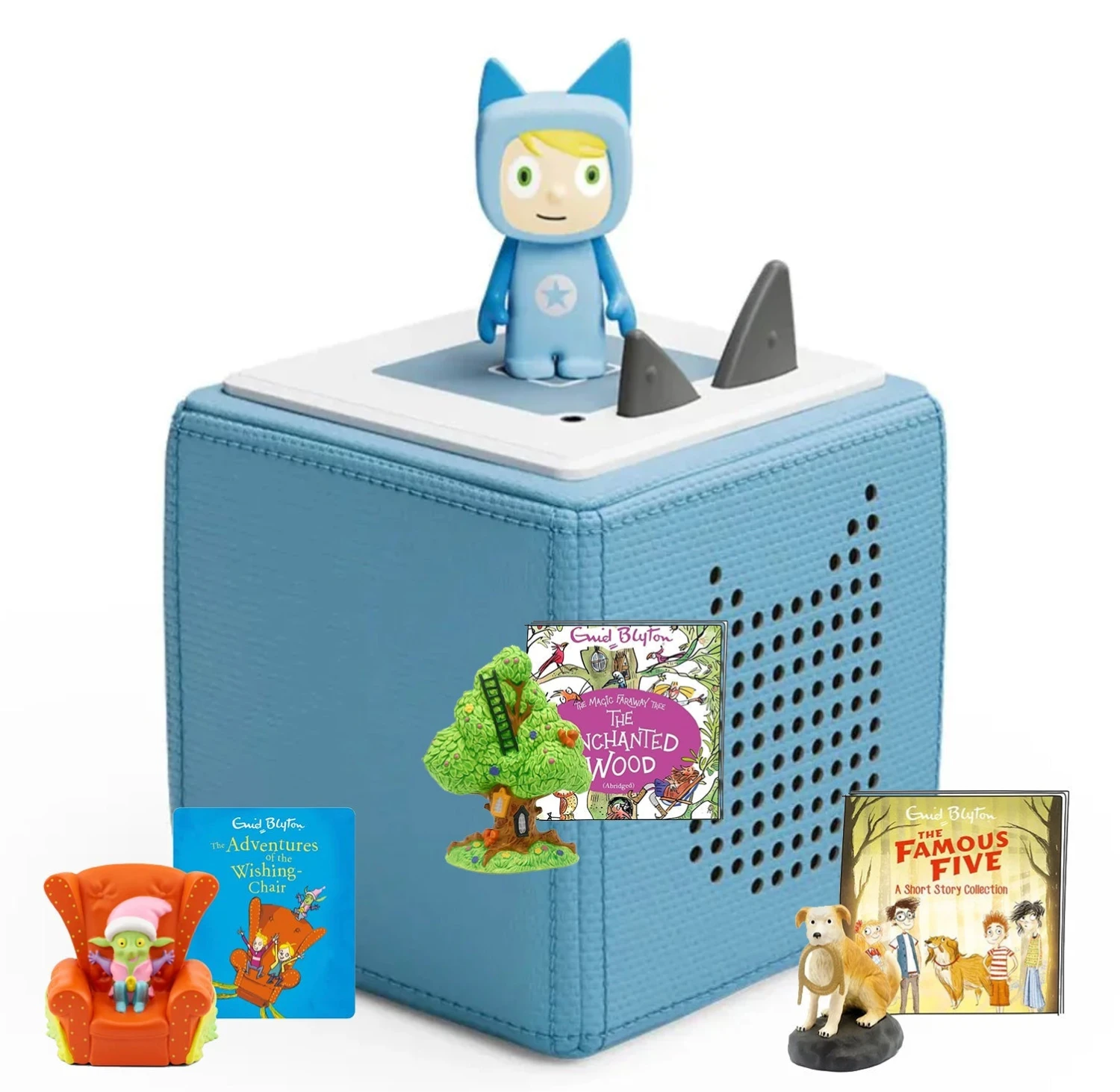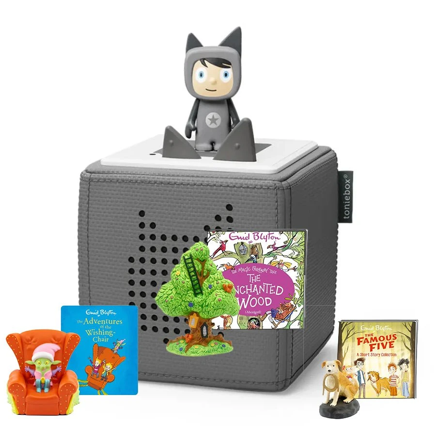 Tonies Enid Blyton bundle, includes a Toniebox, a Creative Tonie and three Conent Tonies – Adventures of the Wishing Chair, The Famous Five Tonie and The Enchanted Wood. Your Creative-Tonie allows you to upload 90 minutes of songs, stories and more. To kick-start the adventure, their new friend comes pre-loaded with 1 hour of songs & stories. Get ready for lots of laughter, learning and fun.